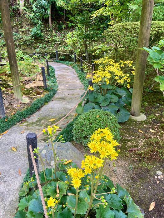 新善光寺の寺庭では、ツワブキやノコンギクなどの秋の花が寺庭のあちらこちらで咲きはじめました。