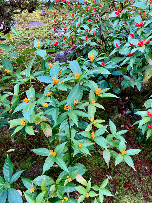 1月は縁起物の「千両」と「万両」の違いを捉えた上で表現しています。ちなみに、千両の実は葉の上、枝の先端にまとまってつき、葉の縁はギザギザになっています。 万両の実は葉の下にぶら下がってつき、葉の縁が波打っています。