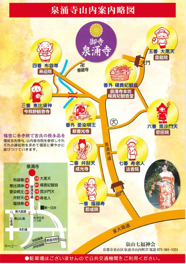 泉山七福神巡りは、即成院(福禄寿)には長寿・幸福、戒光寺(弁財天)には商売繁盛・芸能上達、観音寺(恵比寿神)には商業繁栄・海運守護、来迎院(布袋尊)には知足福・家業繁盛、 雲龍院(大黒天)には福徳、悲田院(毘沙門天)には財宝自在、法音院(寿老人)には長寿・健康、新善光寺(愛染明王)に敬愛和合、泉涌寺(楊貴妃観音)には良縁・諸願成就のご利益がある 九ヶ所(久福神)を巡ります。九福神の「九」は中国において最大の吉数を表し、「久しく」福が続くようにという意味があります。