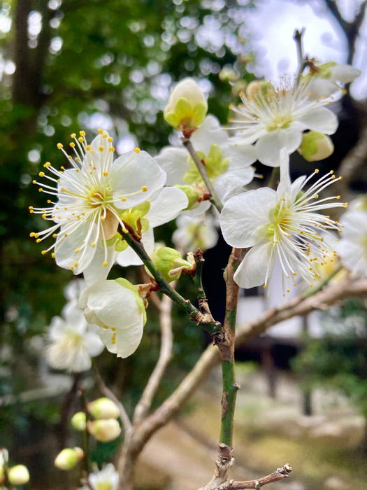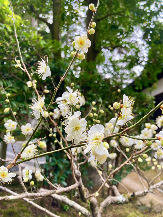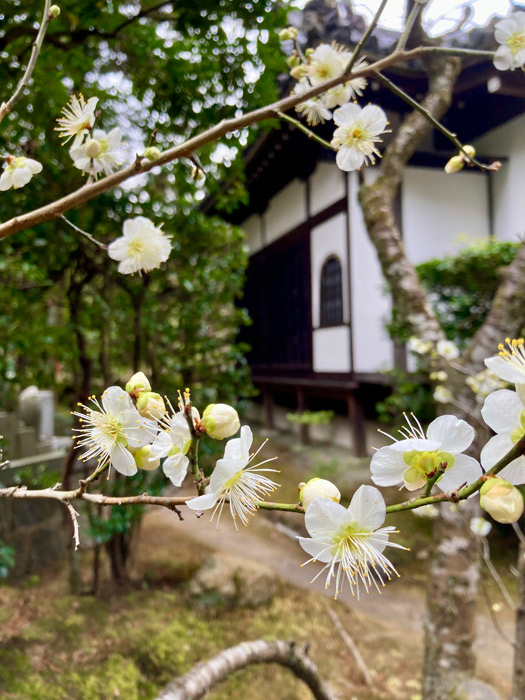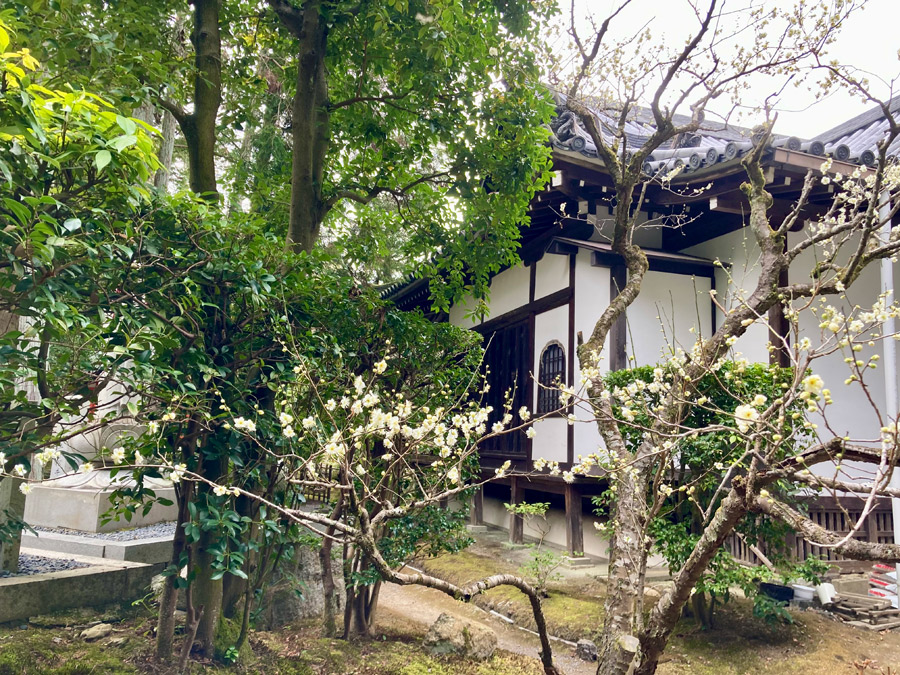 京都も急に暖かくなりました。春を待ちわびるように、 新善光寺では本堂の奥にある白梅が開花しました。
