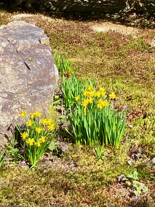 新善光寺の寺庭では、あちこちで水仙の花が咲き始めました。アジサイの丘の水仙の開花はまだもう少しかかりそうです。